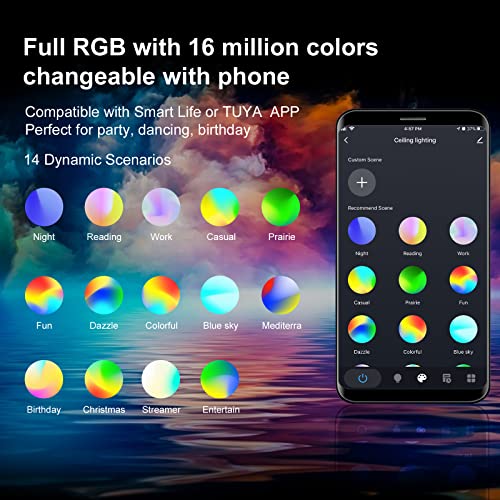 Lampada da soffitto a LED RGB: la lampada da soffitto Smart LED dimmerabile offre la parte anteriore 2700 - 6500 K e posteriore RGB (16 milioni di colori, RGB può essere anche fai da te). La luminosità può essere regolata nell'intervallo di 1%-100%. La parte anteriore e posteriore possono essere illuminate contemporaneamente, l'illuminazione anche separata. Quando è illuminata solo la parte posteriore, può essere utilizzata come luce d'atmosfera e luce notturna.