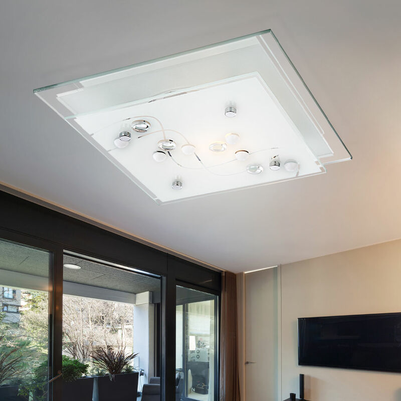 Descrizione: Lampada da parete e soffitto moderna dal design quadrato. Questa lampada colpisce per la sua brillante luminosità e l'aspetto imbattibile. Elementi in metallo e cromo di alta qualità in combinazione con vetro satinato e pietre decorative chiare testimoniano il gusto moderno e lo stile elegante. Questa lampada fa una bella figura in ogni stanza. Inclusa sorgente luminosa a LED da 4 watt di alta qualità a risparmio energetico. Dettagli: • Tipo: Lampada da parete e soffitto • Sorgente luminosa: 1 x E27 • Voltaggio: 230 volt • Materiale: metallo, bianco, cromo • Dimensioni LxPxH in mm: 240 x 240 x 85 • Vetro: Finitura satinata con strisce, pietre decorative chiare • Luce sorgente inclusa nella consegna Dettagli sorgente luminosa • tipo di sorgente luminosa: LED SMD • attacco: E27 • design: sfera • Materiale: alluminio, plastica bianco • flusso luminoso: 320 lm (lumen) • consumo energetico: 4 kWh / 1000h • Temperatura del colore: 2700 K (Kelvin) • Colore della luce: bianco