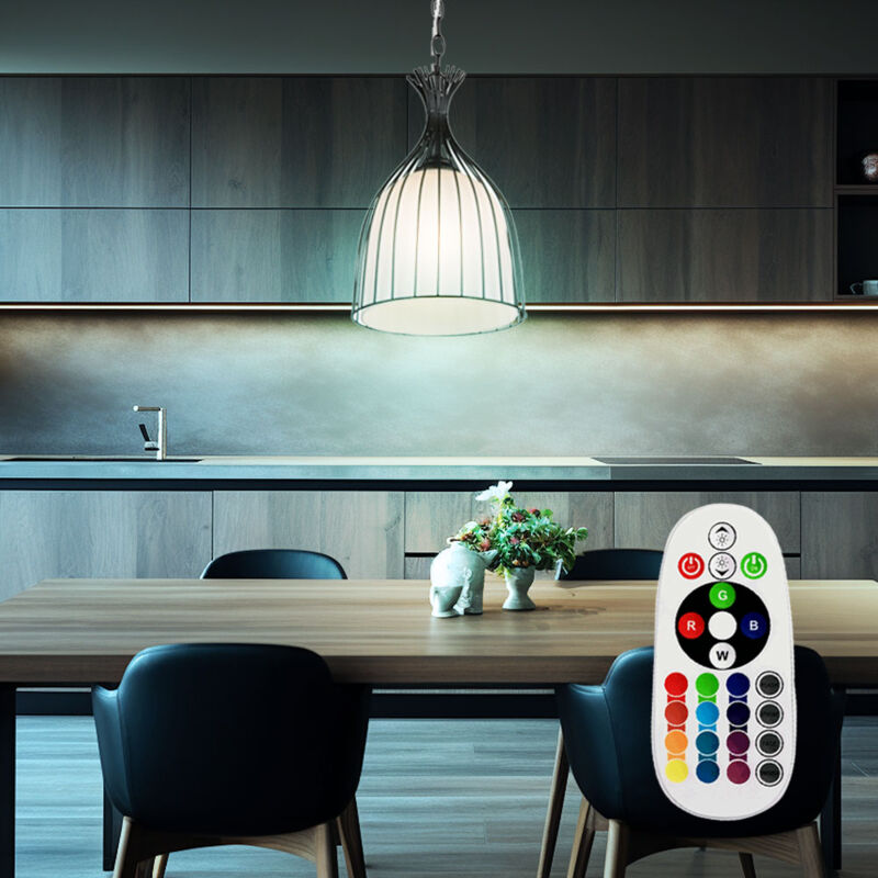 Descrizione Questa lampada a sospensione dallo stile sorprendente e più tradizionale è realizzata in vetro opalino in una gabbia nera. Il metallo nero con la sospensione a catena coordinata spezza la luce in modo molto piacevole, a seconda della sua intensità. Puoi utilizzare altre varianti per creare l'immagine nella tua zona giorno completa l'aspetto della gabbia della stessa serie di modelli. Utilizzando il telecomando in dotazione, l'illuminante LED RGB può essere impostato su diversi colori e garantisce così un'illuminazione d'atmosfera. Un LED RGB illuminante incluso telecomando per luce bianca e controllo RGB incluso. Dettagli luce • Tipo di lampada: lampada a sospensione• Materiale: metallo• Colore: nero • Paralume: vetro opale • diametro x altezza in cm: 23 x 150 • Attacco: 1x E27 • Lampadina inclusa: Sì • Potenza lampada: 1x 9 Watt• Flusso luminoso: 1x 806 lumen• Colore della luce: bianco caldo• Telecomando: solo per l'illuminante LED RGB • Voltaggio: 230 V, 50 Hz