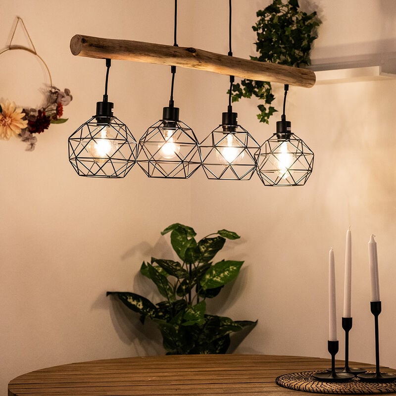 Descrizione Questa lampada a sospensione è una lampada in stile retrò. Quattro paralumi a forma di griglia in metallo nero sono fissati a una trave di legno. Con una lunghezza di 85 cm e un'altezza di 120 cm, la lampada è ideale come illuminazione per il tavolo della sala da pranzo o del soggiorno. Dotato di quattro prese E27, è possibile inserire lampadine con una potenza massima di 60 watt ciascuna nella lampada e determinare così da soli il colore e l'intensità della luce. A causa della durata e del risparmio energetico, si consiglia l'uso di sorgenti luminose a LED. Le lampadine non sono incluse nella fornitura. Dettagli lampada • Tipo di lampada: lampada a sospensione • Materiale: legno • Colore: naturale • Paralumi: metallo nero, design a traliccio • Lunghezza x larghezza x altezza in cm: 85 x 18 x 120 • Prese: 4x E27 • Lampadine incluse: no • Lampadine di potenza: max 4x 60 watt • Alimentazione: 220 -240V, 50 -60Hz