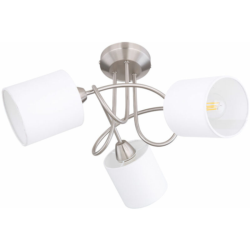 Descrizione Il faretto da soffitto convince grazie al suo design elegante. I tre paralumi in tessuto bianco fissati su un braccio curvo dovrebbero attirare l'attenzione di tutti. I faretti di questo faretto sono dotati ciascuno di un attacco E14, con il quale potete selezionare la lampadina giusta per voi (max. 40 W) e determinare così il colore della luce e l'intensità della luce. A causa del loro risparmio energetico e della loro longevità, consigliamo le lampadine LED. Puoi completare il quadro delle tue quattro mura con altri faretti di questa serie. La fornitura non include le lampadine. Lampada di dettaglio • Tipo di apparecchio: faretto • Materiale: metallo, argento • Paralumi: tessuto, bianco • Grado di protezione: IP20 • Classe di protezione: 1 • Diametro x altezza in cm: 46x27,5 • Prese: 3x E14 • Lampadina inclusa: no • Potenza lampada: 3x massimo 40 watt • Voltaggio: 230 V, 50 Hz