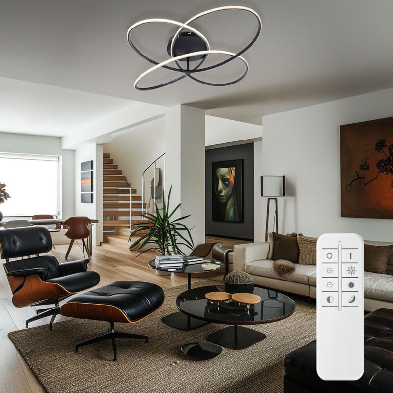 Dettagli • plafoniera metallo nero opaco • plastica bianco opale • funzione memoria • luce notturna • dimmerabile • telecomando • I colori possono essere fissati • D: 800 • H: 135 • incl.1xLED 60W 230V • 5760lm Sorgente • Uscita 3330lm • CCT 3.000-6.000 • Materiale: metallo nero opaco • paralume: plastica opale • colore: nero opaco • colore paralume: opale, bianco • telecomando incl.: si • Circuito CCT (3000K, K, 6000K) • Dimensioni ØxH in cm: 80x13,5 • Numero prese: 1 • Base: LED • Potenza: 60W (watt) • Voltaggio: 230V (Volt) • Flusso luminoso: 3330lm (Lumen) • Vita utile nominale: 20000h (ore) • Sorgente luminosa dimmerabile: si • Sorgente luminosa inclusa: sì