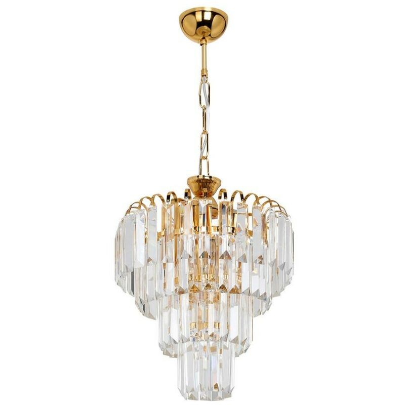 Lampada da soffitto a 3 luci vetro e oro Miranda MDL3831 Lampada da soffitto dotata di 3 luci. Si caratterizza per i numerosi inserti in vetro ed il colore oro. Le tre luci offrono una buona diffusione della luce rendendola calda ed omogenea. Potrai posizionarla nel living, in cucina oppure all'ingresso. Caratteristiche: Materiale metallo e vetro. Colore oro. Forma 4 stadi di inserti di vetro. 3 luci. Altezza 72 cm. Larghezza 31 cm. Attacco lampadine 3 x E27 Facile da pulire.