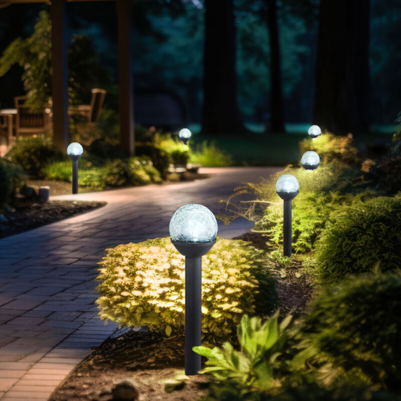 Descrizione Con questo set di luci solari in 6 parti puoi creare straordinari accenti di luce nel tuo giardino. Le lampadine a LED attaccate a un picchetto nero, realizzate in vetro di plastica con un bellissimo effetto crepitio, attirano sicuramente l'attenzione. Le luci del picchetto brillano di una luce bianca chiara e fredda (6.000 Kelvin). Sono perfetti per l'illuminazione di sentieri all'aperto e possono essere posizionati rapidamente ovunque in giardino, balcone o terrazza senza fastidiosi cavi. Funzionate con energia solare, queste lampade solari hanno un tempo di funzionamento massimo di circa 8 ore e sono protette dagli spruzzi d'acqua grazie al grado di protezione IP44. L'illuminante è installato in modo permanente nella lampada. La fornitura comprende sei luci. Particolare lampada • Tipo di apparecchio: apparecchio plug-in • Materiale: plastica, vetro • Colore: nero, trasparente • Grado di protezione: IP44 • Proiettile • Interruttore • Batteria ricaricabile inclusa: 1x
