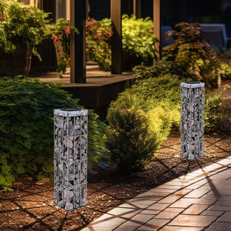 Descrizione Questa lampada solare cuboide (10x10x40 cm) colpisce per il suo bel design in metallo argentato. Puoi riempire la griglia metallica ad esempio con pietre (pietre non incluse), che vengono poi illuminate dalla luce bianca piacevolmente calda (3000 Kelvin) delle lampade a LED ad energia solare. Ciò ti consente di creare un ambiente elegante nella tua area esterna. La sorgente luminosa è incorporata nella lampada. Nella fornitura sono incluse due luci! Dettagli lampada • Tipo di lampada: lampada solare • Materiale: metallo • Argento • Grado di protezione: IP44 • Picchetto da terra • da riempire con pietre (non incluse) • incl.1xAAA Ni -Mh 300mAh • Tempo di combustione di circa 6-8 ore • Lunghezza x larghezza x altezza in cm: 10x10x40 • Presa: 1x LED (installato in modo permanente) • Lampadine incluse: sì • Lampadine: 1x 0,06 watt • Colore della luce: bianco caldo • Temperatura colore: 3000 K • Tensione: 3V