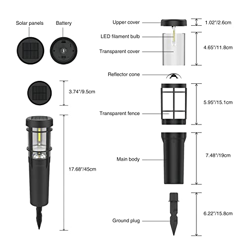 【Lampada a Filamento di Tungsteno ad Alta Luminosità e Luminosità Regolabile】 Solare lampione adotta una lampada a filamento di tungsteno aggiornata e una luce bianca calda 3000K. La luce da giardino ha due livelli di luminosità tra cui scegliere e puoi passare facilmente da alta luminosità a bassa luminosità con un solo pulsante. Crea un effetto luminoso bello e luminoso di notte, molto adatto come decorazione di illuminazione esterna, come giardini, prati, marciapiedi, cortili, cortili, ecc.