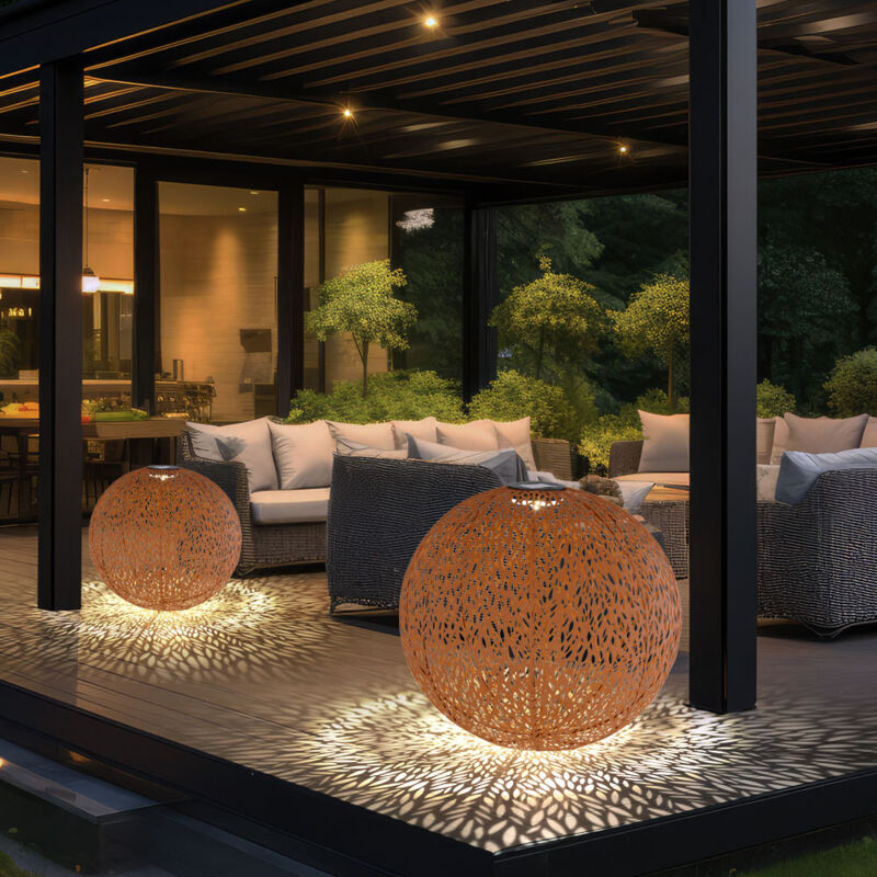 Descrizione Questa lampada solare sferica in metallo color ruggine (ø 40 cm) sarà una meravigliosa aggiunta al tuo giardino. Può essere ancorato facilmente e in modo flessibile su terreni morbidi utilizzando i picchetti. Il motivo sui lati in metallo viene splendidamente proiettato verso l'esterno dalla piacevole luce bianca calda (3000 Kelvin) della lampadina LED ad energia solare. Questo può aiutare a creare un'atmosfera suggestiva nella tua area esterna. La sorgente luminosa a LED è installata in modo permanente nella lampada. Nella consegna sono incluse due luci! Lampada dettagli • Tipo di lampada: luce solare • Materiale: metallo • Colore: ruggine • Punto terra con sfera • con punzonature decorative • Interruttore • Tempo di illuminazione: 6-8 ore • Batteria: 1x3,7 V agli ioni di litio 300 mAh • Grado di protezione: IP44 • Diametro x altezza in cm: 40 x 51 • Sorgente luminosa: 1x LED • Lampadine incluse: sì (installate in modo permanente) • Potenza lampada: 1x 0,12 watt • Colore