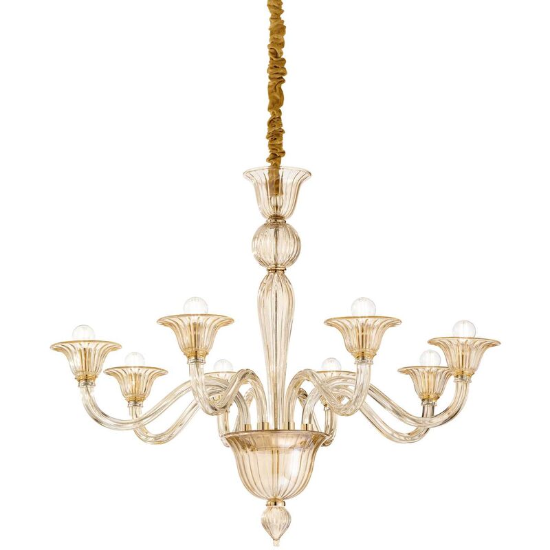 Lampada a sospensione ambra D 890 x H min 1000 - max 1840 mm Caratteristiche: Lampadina inclusa=No Kit fissaggio=No Attacco lampada=E14 Volt=220-240 V AC Watt=E14 max 8 x 40W Finitura=ambra Colore rosone=oro Materiale=Vetro Dimensioni= D 890 x H min 1000 / max 1840 mm