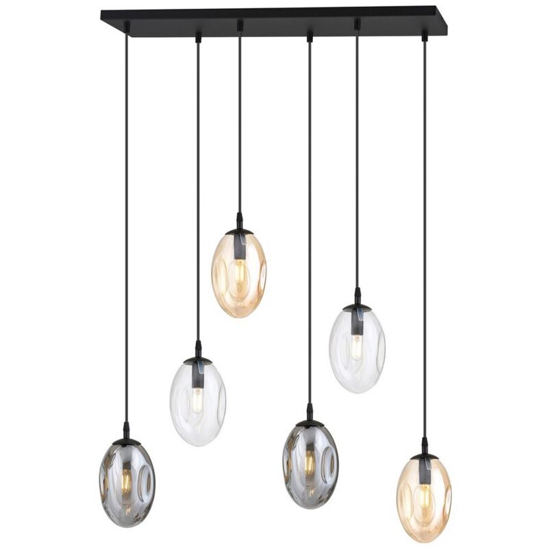 Questa lampada a sospensione è la soluzione perfetta per illuminare con stile la casa o l'ufficio. Grazie al suo design è ideale per la zona giorno e la zona notte. Kit di montaggio incluso, facile da pulire e facile da montare. Colore: Nero, Oro, Ambra Materiale: Acciaio verniciato a polvere, Vetro Set: 1 Dimensioni Prodotto: 70x100x22 cm Peso Prodotto: 4,20 Peso Supportato: - Info Lampadine: 6 x E14, 230V, 10W MAX LED, IP20 Lampadina: Non Inclusa Dimensioni Imballo: 98x29x30 cm Peso Imballo: 5,20 Numero di Colli: 1