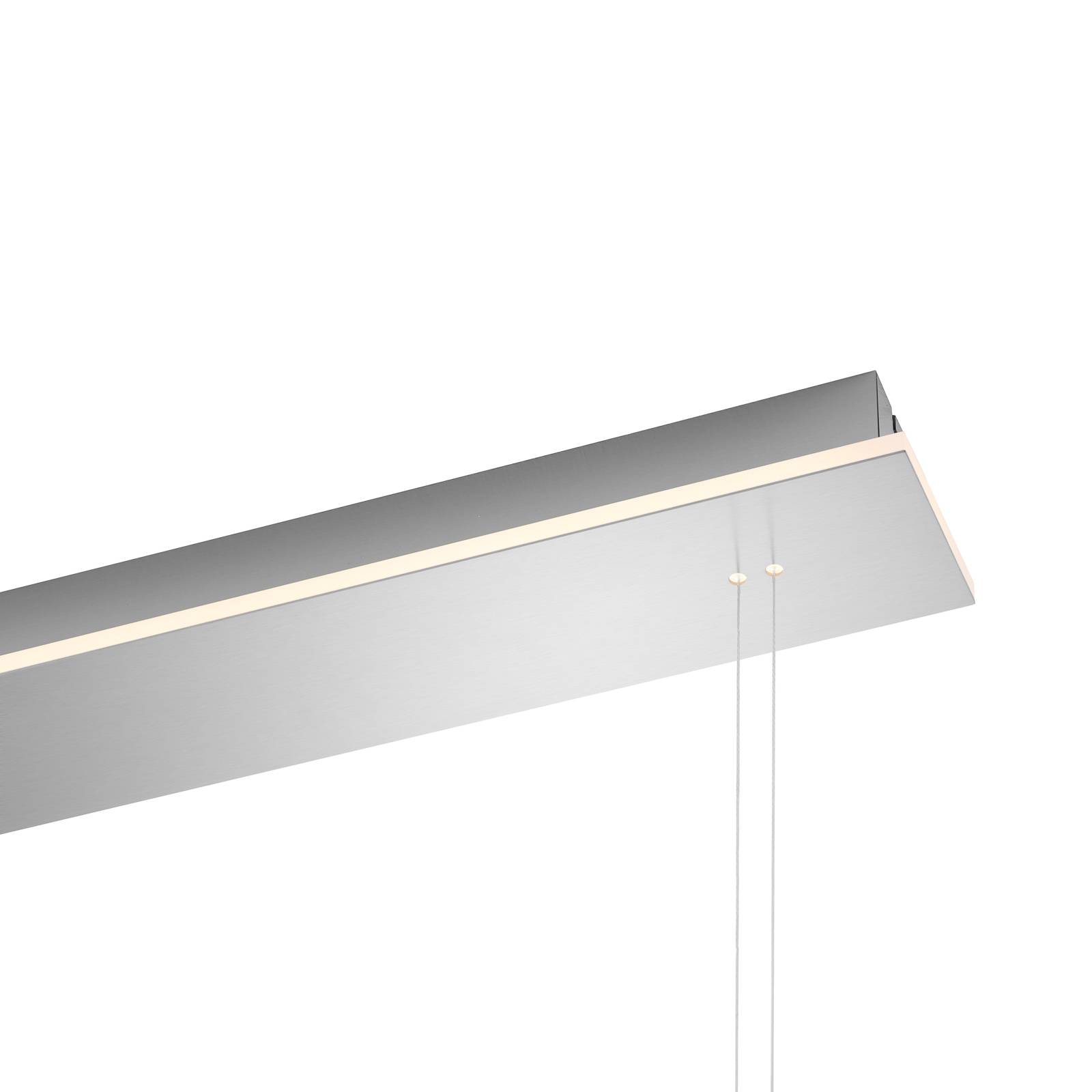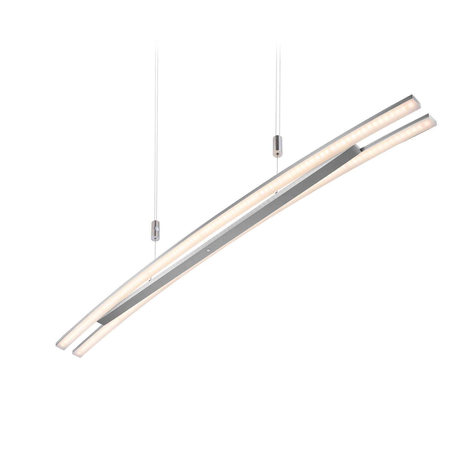 Apparecchio a sospensione Sam LED regolabile in altezza, dimmerabileL'illuminazione perfetta sopra i tavoli è il moderno apparecchio a sospensione Sam LED. Grazie a un semplice meccanismo, l'apparecchio può essere comodamente regolato in altezza, adattandosi così perfettamente alle rispettive esigenze. Il paralume allungato e leggermente curvo è composto da tre binari, ciascuno dotato di moderni LED nascosti dietro un diffusore in plastica bianco latte. La guida centrale punta con il lato LED verso l'alto, in modo che l'apparecchio a sospensione Sam LED non emetta solo luce direttamente verso il basso, ma anche indirettamente verso l'alto. La luce può anche essere attenuata con l'aiuto di un piccolo pulsante.