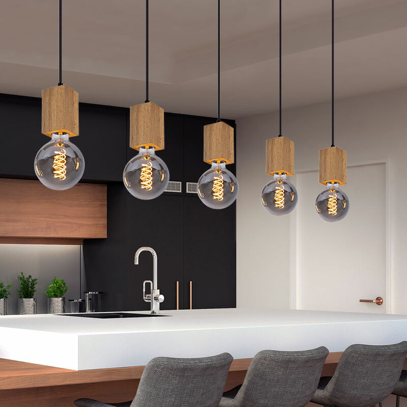 Descrizione La nostra lampada a sospensione combina un design elegante con materiali di alta qualità. La lampada è realizzata in metallo e legno MDF scuro, che le conferisce un aspetto moderno ed elegante. Il cavo in PVC nero si inserisce perfettamente nel quadro generale. Grazie alla possibilità di regolare l'altezza della lampada, la lampada può essere adattata individualmente alle vostre esigenze. Con questa lampada a sospensione potrete creare un'atmosfera piacevole e dare un tocco di stile alla vostra stanza. Le lampadine non sono comprese nella fornitura. Lampada dettagli • Tipo di lampada: lampada a sospensione • Materiale: metallo, MDF • Colore: nero, aspetto legno • Grado di protezione: IP20 • Classe di protezione: 2 • Altezza regolabile • Lunghezza x larghezza x altezza in cm: 115 x 6 x 120 • Prese: 5x E27 • Lampadine incluse: No • Potenza lampada: 5x massimo 60 watt • Voltaggio: 230 V, 50 Hz