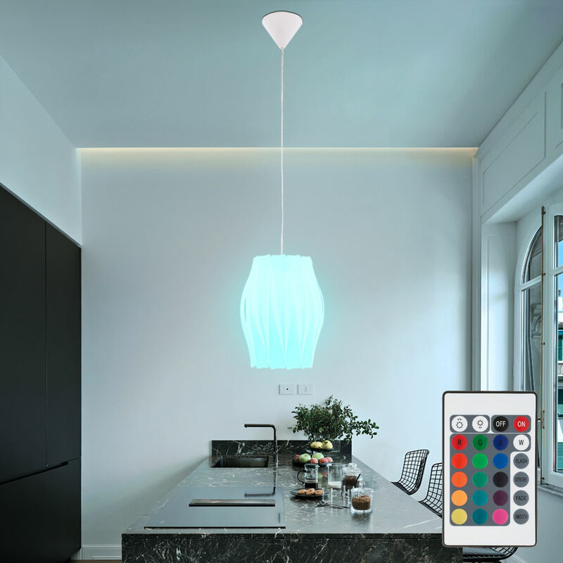 Descrizione Elegante lampada a sospensione per interni dal design moderno Non importa se soggiorno, sala da pranzo o camera da letto, questa lampada a sospensione si adatta a quasi tutti gli spazi abitativi. Un vero colpo d'occhio! Utilizzando il telecomando in dotazione, la sorgente luminosa RGB può essere impostata in 15 colori diversi e fornisce così un'illuminazione d'atmosfera. Rispetto alle luci 'normali', i faretti a LED consumano solo un minimo quantità di elettricità e hanno un consumo persino inferiore rispetto alle lampade a risparmio energetico. Questo protegge l'ambiente e il tuo portafoglio. Una lampada LED da 7 watt di alta qualità a risparmio energetico con telecomando per luce bianca e controllo RGB è inclusa nella fornitura. Dettagli lampada • Tipo di lampada: lampada a sospensione • Materiale: plastica bianca • Paralume: plastica bianca • Grado di protezione: IP20 • Dimensioni DxH in cm: 30x150 • Attacco: 1x E27 • lampadine incluse: si • lampadine di alimentazione