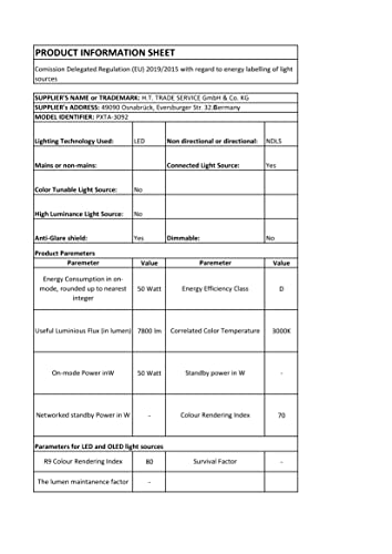 Dati tecnici:- Classe energetica: D- Illuminazione: 300 LED (integrata)- Potenza: max. 50W- Tensione: 230V, 50Hz- Temperatura colore: 3,000 K- Luminositá: 7.800 lumen- Vita media: 50,000 ore- Tipo di interruttore: a muro