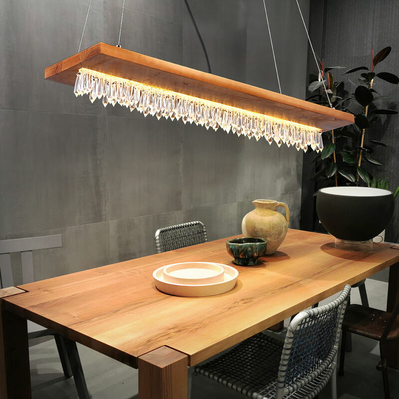 Descrizione Questa lampada a sospensione (80x20 cm) aggiunge un'elegante fonte di luce alla tua casa. Consiste in una trave di legno marrone che è attaccata a quattro cavi di metallo e ha una barra di plastica opalina al centro da cui pendono bellissimi cristalli di plastica. Questo copre le lampadine a LED incluse, che forniscono 1546 lumen di luce con un piacevole colore della luce di 3000 Kelvin (bianco caldo). Inoltre, l'altezza della lampada a sospensione può essere regolata fino a 145 cm durante l'installazione. Puoi aggiungere il tocco finale ai tuoi interni con mancano altri modelli della stessa serie. dettagli apparecchio • Tipo di lampada: lampada a sospensione • Materiale: metallo, legno, cristalli di plastica• Colore: nero, marrone, opale, trasparente • Protezione classe: IP20 • Lunghezza x larghezza x altezza in cm: 80x20x145 • Sorgente luminosa: 1x LED • Sorgente luminosa inclusa: Sì • Potenza sorgente luminosa: 1x 25 watt • Flusso luminoso: 1x 1546 lumen• Colore luce