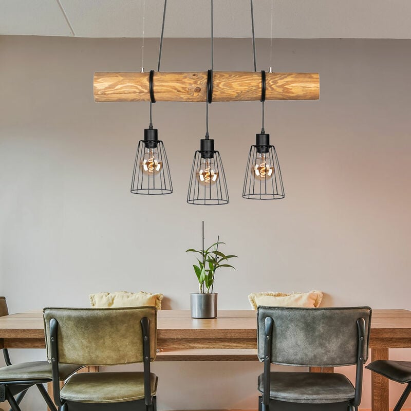 Descrizione La lampada colpisce per il suo design distintivo. La combinazione di materiali di legno di pino e metallo ha un aspetto molto moderno e si integra armoniosamente in un'ampia varietà di stili di arredamento contemporanei. Questa lampada a sospensione si integra al meglio su un tavolo della sala da pranzo, sul tavolo del soggiorno o sopra il mobile della cucina. Grazie alle prese E27 esistenti, sei libero di scegliere l'illuminante e quindi la scelta del colore e dell'intensità della luce. Le lampadine non sono incluse nella fornitura. Particolare lampada • Tipo di lampada: lampada a sospensione • Materiale: legno di pino, metallo • Colore: tinto nero • Grado di protezione: IP20 • Grigliadesign • Diametro trave in cm: 8-12 • Diametro paralume in cm: 14 • Pannello del soffitto lunghezza x larghezza x altezza in cm: 46 x 5 x 3 • Lunghezza x larghezza x altezza in cm: 70 x 5 x 150 • Prese: 3x E27 • Lampadina inclusa: No • Potenza della lampada: 3x massimo 60 watt • Tensione