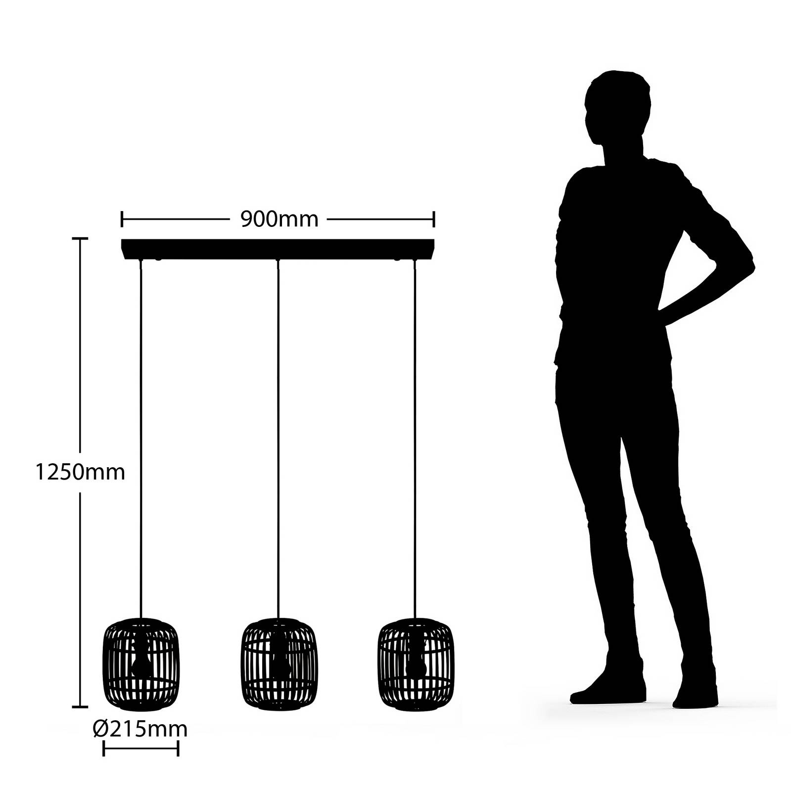 Lampada a sospensione a 3 luci Canyana con paralume in rattan naturale La lampada a sospensione Canyana a sospensione da bar conferisce un tocco di naturalezza a qualsiasi ambiente grazie ai suoi tre paralumi in rattan, che sono montati su un rosone in metallo nero. È ideale per illuminare un lungo tavolo da pranzo o un bancone in cucina. I tre paralumi in rattan di colore naturale convergono in alto e in basso per creare una forma a bulbo. Ciascun paralume è dotato di una portalampada E27 che può essere utilizzata con una sorgente luminosa fino a 40 W. Per ottenere un bell'effetto visivo e luminoso, si consiglia di scegliere lampadine a filamenti con bulbi in vetro trasparente o colorato, ad esempio lampadine rustiche chiare. Le sorgenti luminose abbinate possono essere selezionate e ordinate direttamente.