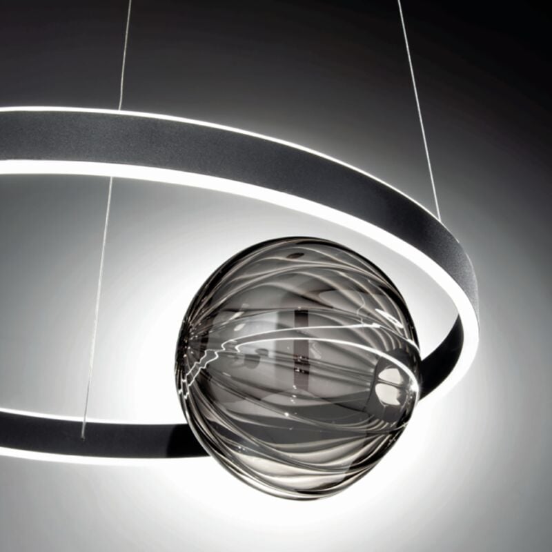 Lampadario a sospensione Led LISBOA a doppia emissione piu COB, realizzato interamente in metallo verniciato con diffusore in vetro soffiato. Il led COB porta una maggiore densita' di luce complessiva, e quindi una qualita' complessivamente migliore. Cavetti regolabili in lunghezza. Una lampada perfetta per arredare e illuminare ogni spazio della vostra casa con un tocco di originalita'. CARATTERISTICHE Colore montatura: Nero Colore diffusore: Fume' Materiale: Metallo, vetro Tipologia: Lampada a sospensione Modello: Piccolo Altezza max: 220 cm Diametro: 60 cm Dimmerabile: Si Illuminazione: LED COB integrato Potenza: 35W 1700-3500 LM Input: 220-230V Colore luce: 3000K
