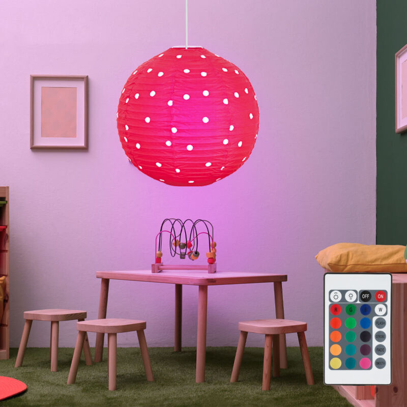 DescrizioneModerna lampada a sospensione per il soggiorno Sia in soggiorno, in sala da pranzo o anche nella camera dei bambini, questa lampada fa una buona figura ovunque. Questo apparecchio a sospensione è un vero e proprio colpo d'occhio.Rispetto agli apparecchi 'normali', i faretti a LED consumano solo una minima quantità di elettricità e hanno un consumo ancora più basso rispetto alle lampade a risparmio energetico. Questo non solo protegge l'ambiente, ma anche il tuo portafoglio. Una lampada LED di alta qualità da 7 watt a risparmio energetico con telecomando per luce bianca e controllo RGB è inclusa nella fornitura.Dettagli lampada • Tipo di prodotto: Lampada a sospensione • Montatura: Acciaio • Colore montatura: bianco • Paralume: Tessuto • Colore Paralume: Rosso con puntini bianchi • Diametro sfera in cm: 40 • Lunghezza cavo in cm: 120 • attacco: 1x E27 • lampadine incluse: si • lampadine di alimentazione: 1x 7 watt • flusso luminoso: 470 lumen • colore luce: bianco caldo