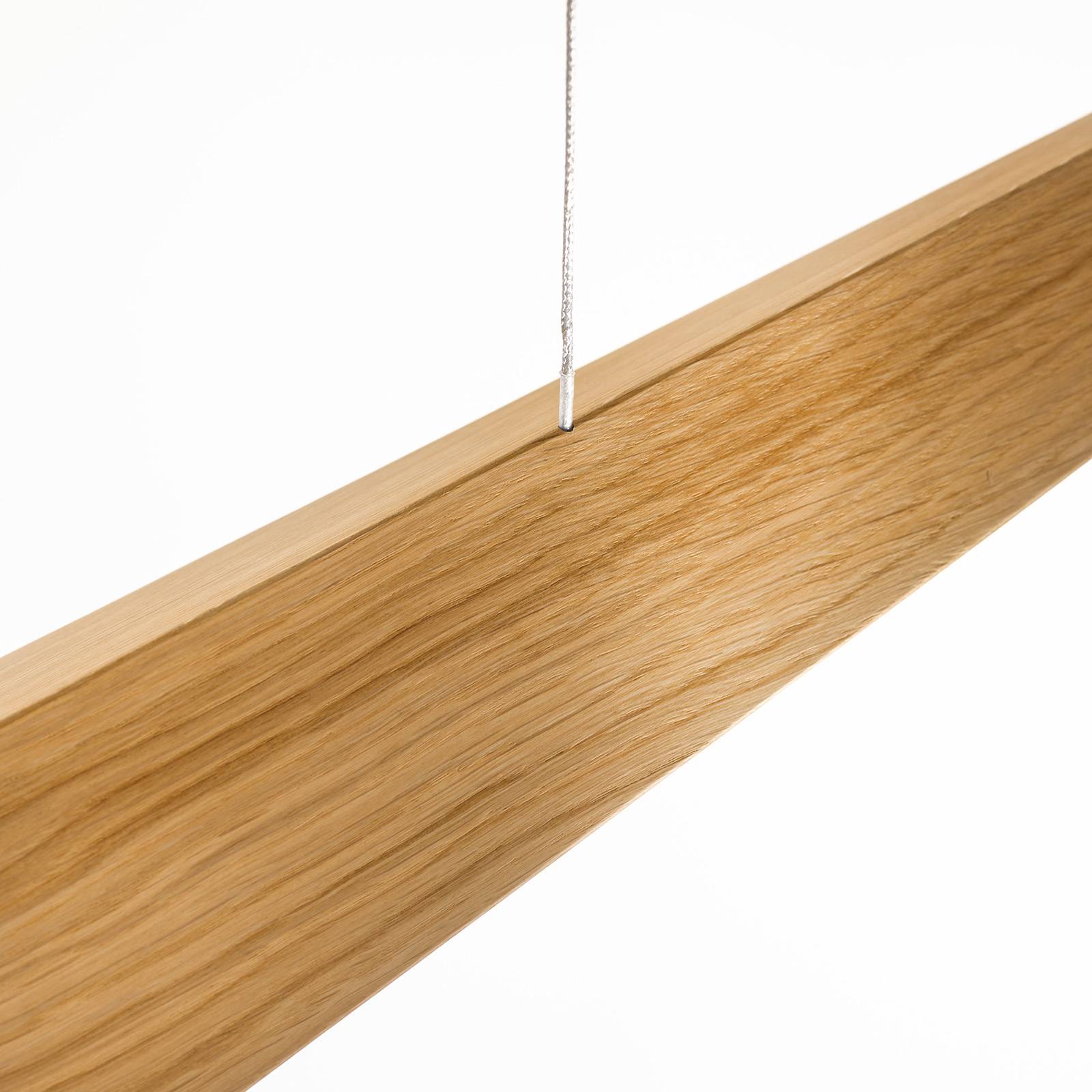 Lampada a sospensione in legno regolabile in altezza Dila in rovere naturale, prodotta in Germania Natura e tecnologia sono qui combinate in modo speciale. La moderna lampada a sospensione Dila è composta da elementi in legno massiccio di quercia, che formano visivamente il paralume della lampada e creano il fascino rustico e speciale della luce. I due elementi in legno sono così abilmente incollati tra loro da adagiarsi perfettamente sulla barra luminosa triangolare e quindi racchiuderla perfettamente. La lavorazione del legno è stata eseguita a mano con grande abilità, esperienza e precisione, come si può notare a prima vista. Poiché la luce della lampada LED a sospensione Dila viene emessa direttamente verso il basso, questa lampada in legno di alta qualità è perfetta per l'illuminazione della tavola. I LED integrati fannotto LED di un gradevole bianco caldo senza sfarfallio e sono potenti e a risparmio energetico. Naturalmente, la luminosità e l'intensità della luce possono essere variate con un dimmer esterno (controllo di fase del bordo anteriore o posteriore). L'elevato valore CRI di oltre 90 garantisce inoltre un'ottima resa cromatica, che crea un'atmosfera luminosa naturale e piacevole. La lampada a sospensione in legno Dila è un apparecchio di qualità prodotto in Germania che, oltre al suo fascino rustico e alla moderna tecnologia di illuminazione, si distingue anche per la sua comoda funzionalità. Durante l'installazione, un vano di connessione extra-large nella scatola del soffitto garantisce spazio sufficiente per tutti i cablaggi e, una volta installata con successo, la lampada LED a sospensione Dila può essere comodamente regolata in altezza (105-195 cm). Entrambi i vantaggi sono notevoli e rendono il portacandele in legno Dila la prima scelta per un'illuminazione da tavolo di successo, visivamente accattivante e funzionale, oltre che per il suo look speciale.