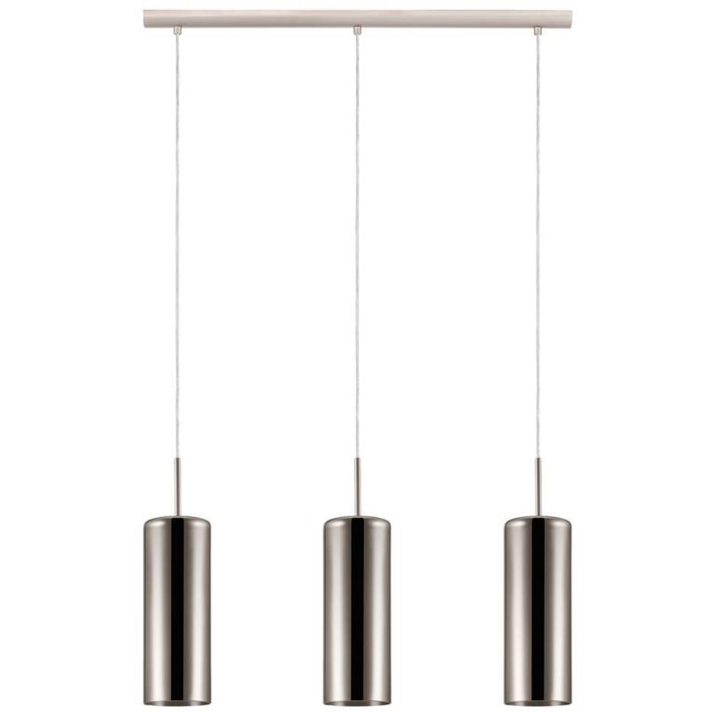 Collezione Selvino IL CILINDRO SI FA LUCE La lampada a sospensione SELVINO ha tre paralumi in vetro fumé oro-trasparente a forma di cilindro che scendono da una lunga struttura in nichel opaco.. Questo lampadario è adatto a stili moderni e minimal della sala da pranzo o nel soggiorno. La lampadina, con attacco E27, non è inclusa.