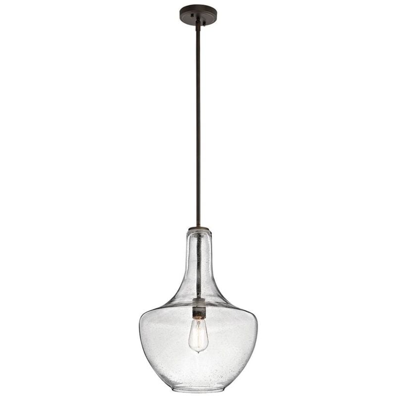 Collezione Everly LAMPADA MEMORABILE Lampada media a sospensione a 1 luce - Bronzo Antico. Il design della collezione Everly, di dimensioni generose, si basa su paralumi decorativi in vetro soffiato. Le lampade a sospensione con finitura cromata sono caratterizzate da vetro trasparente, mentre la finitura bronzo antico è caratterizzata da vetro effetto seminato. Questi articoli sono resi ancora più memorabili se utilizzati con una lampada a filamento LED in stile vintage. Contemporanei o tradizionali, queste lampade possono essere utilizzate singolarmente o in multipli per valorizzare ogni ambiente.