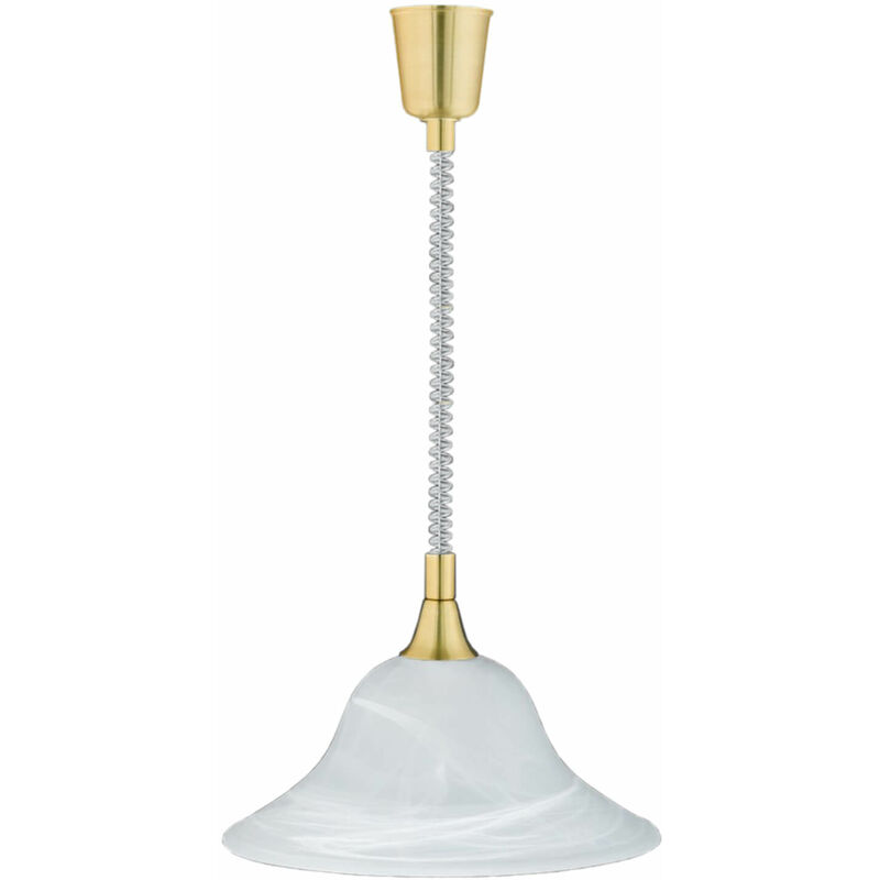 Dettagli del prodotto Materiale: metallo, vetro, opaco Dimensioni: larghezza: 390 mm, profondità di sospensione: 1600 mm, diametro: 390 mm Attacco: 1x E27 fino a. 60 Watt Classe di protezione dagli spruzzi: IP20 Colore: Ottone opaco, bianco cancellato Peso: 2050 grammo Descrizione del prodotto Classica lampada a sospensione in bianco e ottone, la lampada a sospensione è facilmente regolabile in altezza: ideale come lampada da cucina e sala da pranzo, effetto alabastro: per un tocco nostalgico
