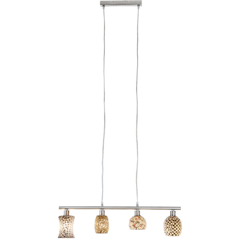 Descrizione Questa straordinaria lampada a sospensione attira davvero l'attenzione. I diversi paralumi in vetro non solo hanno forme diverse ma anche diversi motivi a mosaico. Sembra perfetto su un tavolo da pranzo o da soggiorno in ogni stile di vita e di arredamento. Grazie alle quattro prese E14, hai il diritto di scegliere la sorgente luminosa e quindi la scelta del colore e dell'intensità della luce. Le lampadine non sono incluse nella fornitura. Dettagli lampada • Tipo di lampada: lampada a sospensione • Materiale: metallo, vetro • Colore: nichel opaco, multicolore • Design a mosaico • Lunghezza x larghezza x altezza in cm: 75 x 17 x 150 • Prese: 4x E14 • Lampadine incluse: no • Lampadine di potenza: 4x max 40 watt • Voltaggio: 230V, 50Hz