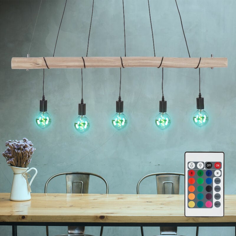 Descrizione Questa splendida lampada combina il fascino rustico con lo stile contemporaneo per creare un pezzo sorprendente che è il tocco finale perfetto per un soggiorno - o sala da pranzo. Le lampade a sospensione a 5 luci sono sospese a un cavo avvolto attorno a una trave di legno. Con il suo design semplice e unico, è l'aggiunta perfetta a qualsiasi casa. Utilizzando il telecomando in dotazione, le lampadine a LED RGB possono essere commutato su diversi La regolazione dei colori assicura che l'illuminazione sia d'atmosfera. Cinque lampadine LED RGB con telecomando per luce bianca e controllo RGB sono incluse nella fornitura. Dettagli luce • Tipo di lampada: lampada a sospensione• Materiale: legno• Colore: marrone, nero• classe di protezione: IP20• lunghezza x larghezza x altezza in cm: 120x8x120 • Portalampade: 5x E27• Lampade incluse: Sì• Potenza lampada: 5x 9 watt• Flusso luminoso: 5x 806 lumen• Colore della luce: bianco caldo• Telecomando: Solo per le lampade LED RGB