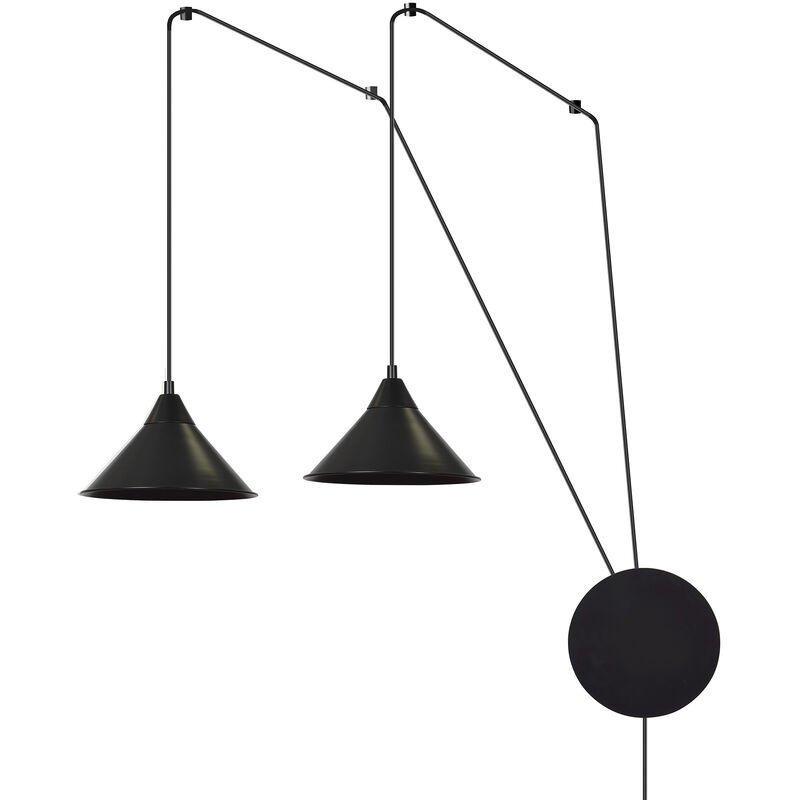 Dettagli del prodotto Materiale: Metallo Dimensioni: larghezza: 290 mm, profondità di sospensione: 400-4900 mm Attacco: 2x E27 fino a. 60W Classe di protezione dagli spruzzi: IP20 Colore: Nero Descrizione del prodotto Straordinaria lampada a sospensione con spina e interruttore per il collegamento alla presa da 230 V;