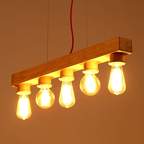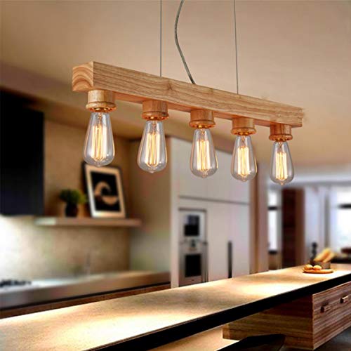 Lampada a Sospensione Vintage in Legno Luce Sospesa da Tavolo da Sala da Pranzo di Design Retrò, 5 Luci, Base E27 max 40W, Lampadario per Kitchen Bar Restaurant Cafe, Regolabile in Altezza, L70cm