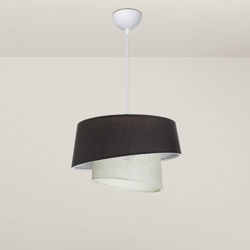 Lampada a sospensione La nostra lampada a sospensione rappresenta un perfetto connubio tra minimalismo e modernità. La montatura semplice in plastica garantisce leggerezza e facilità di installazione mantenendo un aspetto pulito e discreto. Il paralume ha una forma circolare che diffonde uniformemente la luce creando un'atmosfera calda e accogliente per diversi ambienti. Una caratteristica distintiva di questa lampada è il suo design complesso ma elegante caratterizzato dalla presenza di due cilindri tagliati. Le linee dei cilindri si intersecano creando un intrigante gioco di forme geometriche. Questa particolarità delle linee aggiunge un tocco di originalità permettendo alla luce di filtrare attraverso le fessure in modi unici arricchendo l'ambiente con un'illuminazione dinamica e visivamente interessante. La lampada a sospensione trova la sua collocazione ideale in diverse aree della casa. Nella sala da pranzo posizionata sopra il tavolo crea un'illuminazione focalizzata e