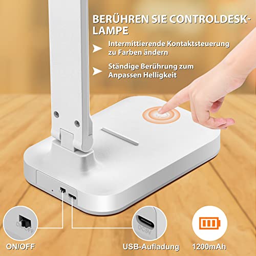 Lampada da tavolo a LED, controllo touch della lampada da tavolo, lampada da lettura senza Blu-ray, senza sfarfallio, batteria da 1200 mAh con ricarica USB, protezione continua per gli occhi