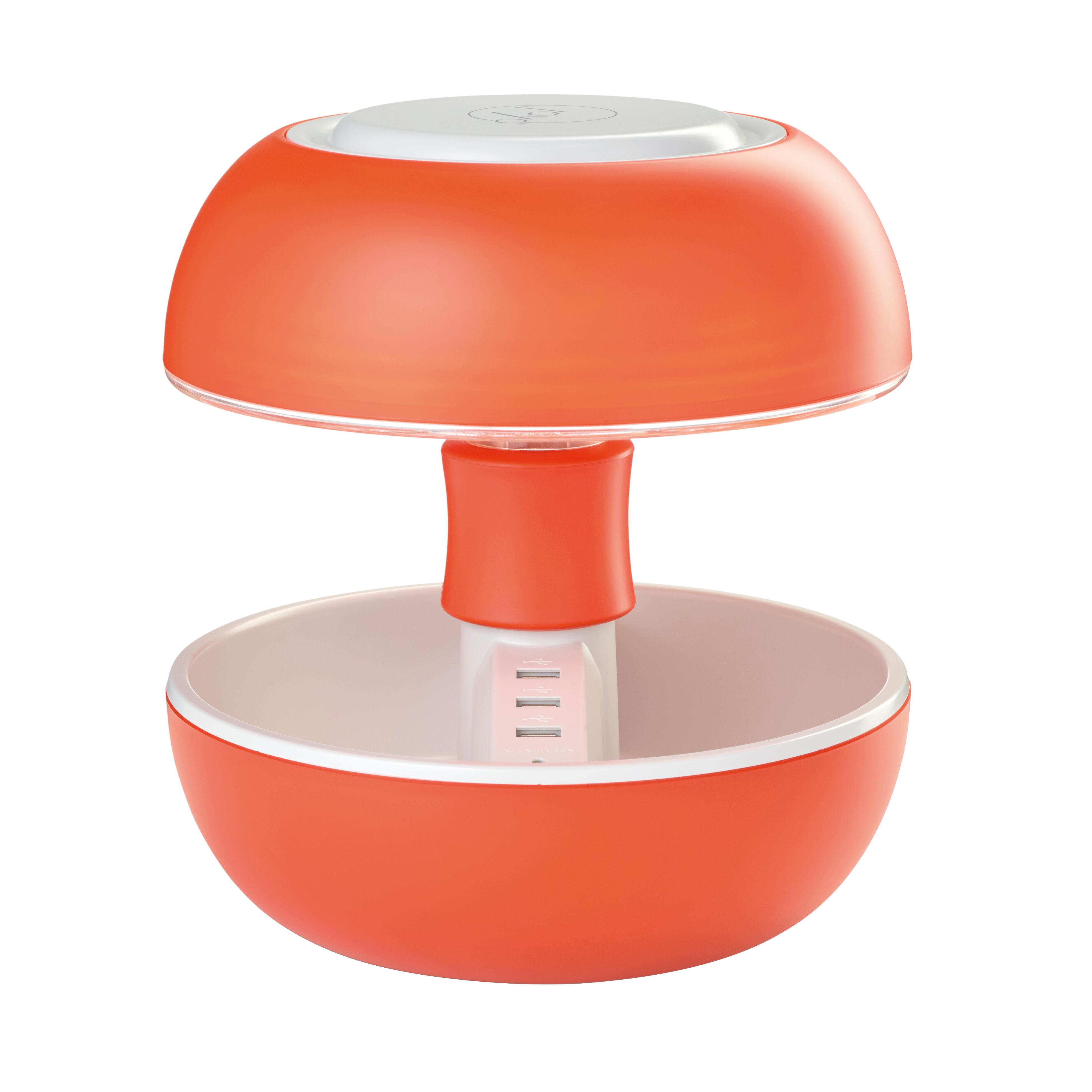 Struttura in plastica arancione chiaro, LED integrato3,5W, luinosità 340 lumen, luce naturale, altezza 27.2 cm. Multifunzione, ricarica tramite porte USB, svuotatasche e lampada da comodino/tavolo. Multifunzione, ricarica tramite porte USB, svuotatasche e lampada da comodino/tavolo