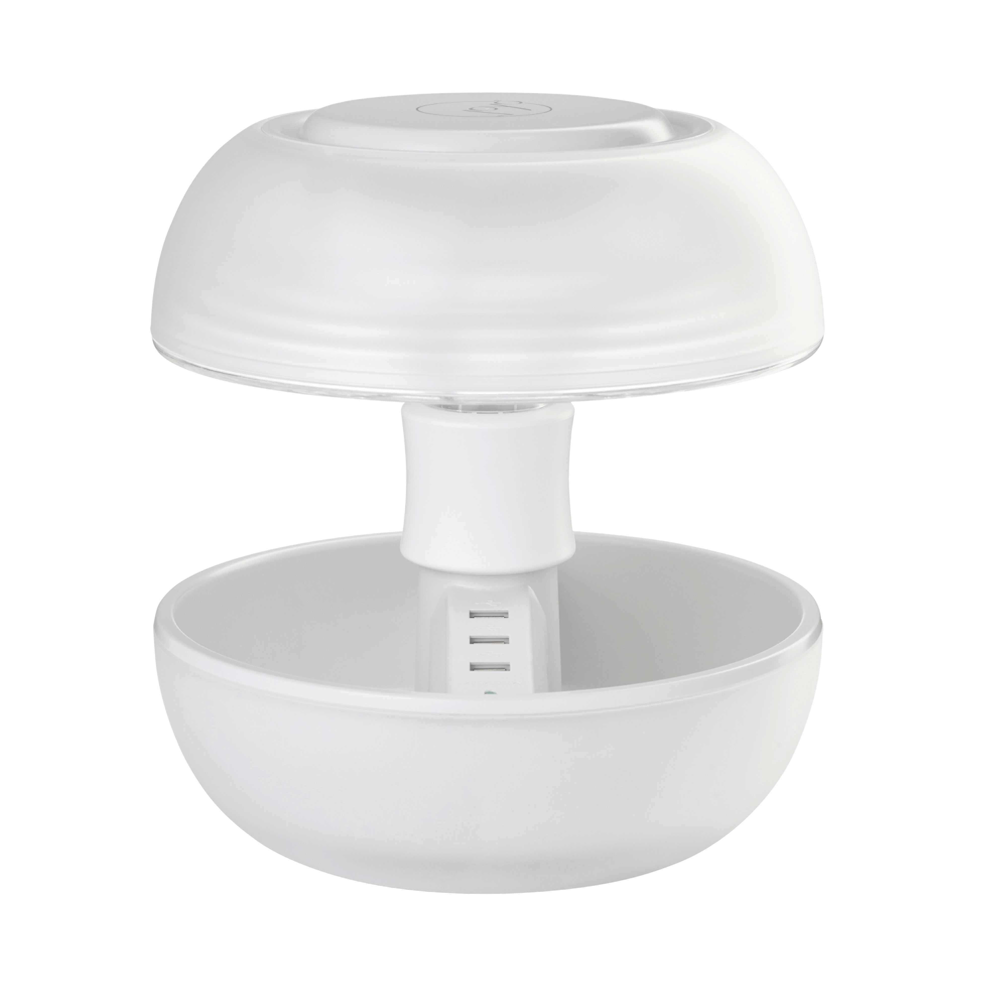 Struttura in plastica bianca, LED integrato3,5W, luinosità 340 lumen, luce naturale, altezza 27.2 cm. Multifunzione, ricarica tramite porte USB, svuotatasche e lampada da comodino/tavolo. Multifunzione, ricarica tramite porte USB, svuotatasche e lampada da comodino/tavolo
