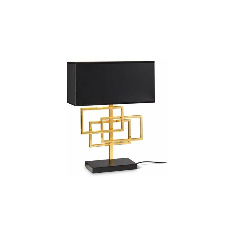 Lampada da tavolo con montatura in metallo rifinita in ottone. Base nera opaca e Paralume in pvc con bordi in tessuto.