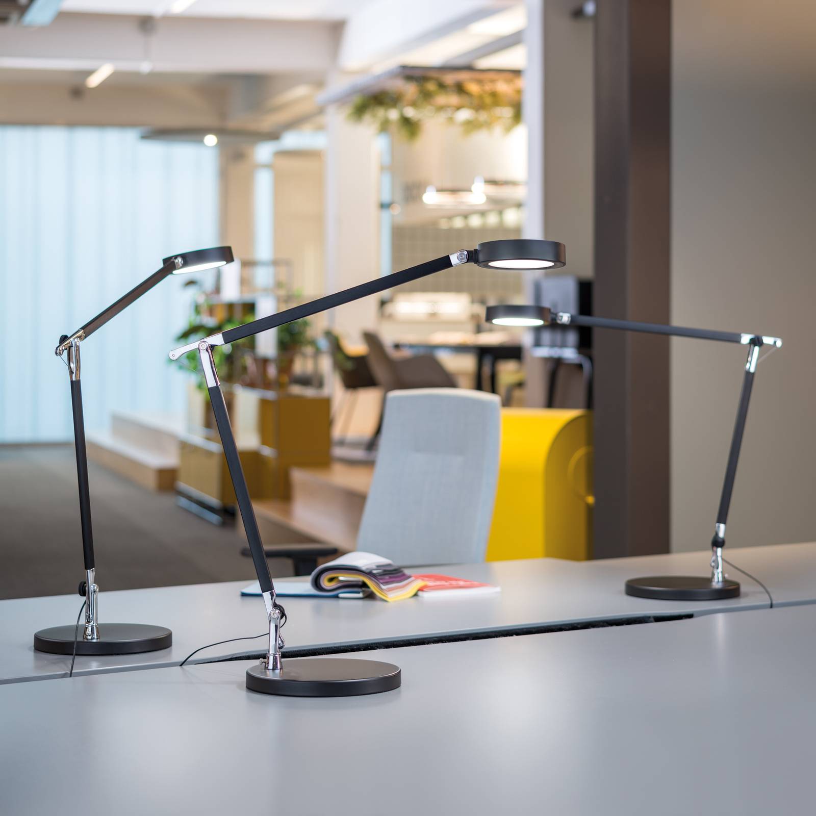 Lampada da scrivania a LED MAULgrace: colore di luce regolabile in continuo, dimmerabile in 4 fasi Con questa lampada da scrivania a LED, che emette luce priva di ombre dall'alto, il lavoro d'ufficio a casa diventa un piacere. Con MAULgrace, il colore della luce può essere regolato in modo continuo da bianco caldo a bianco neutro fino alla luce del giorno, adattandosi così sempre alle esigenze individuali. Anche la luminosità può essere dimmerata in quattro fasi. L'azionamento avviene tramite il campo tattile sulla testa della lampada. L'apparecchio con il braccio a doppio snodo, che può essere ruotato e inclinato come la testa dell'apparecchio, copre un ampio raggio di illuminazione. Un inserto di peso è incorporato nella base per garantire un supporto sicuro in ogni momento, e la base è anche dotata di un cuscinetto per proteggere la scrivania.