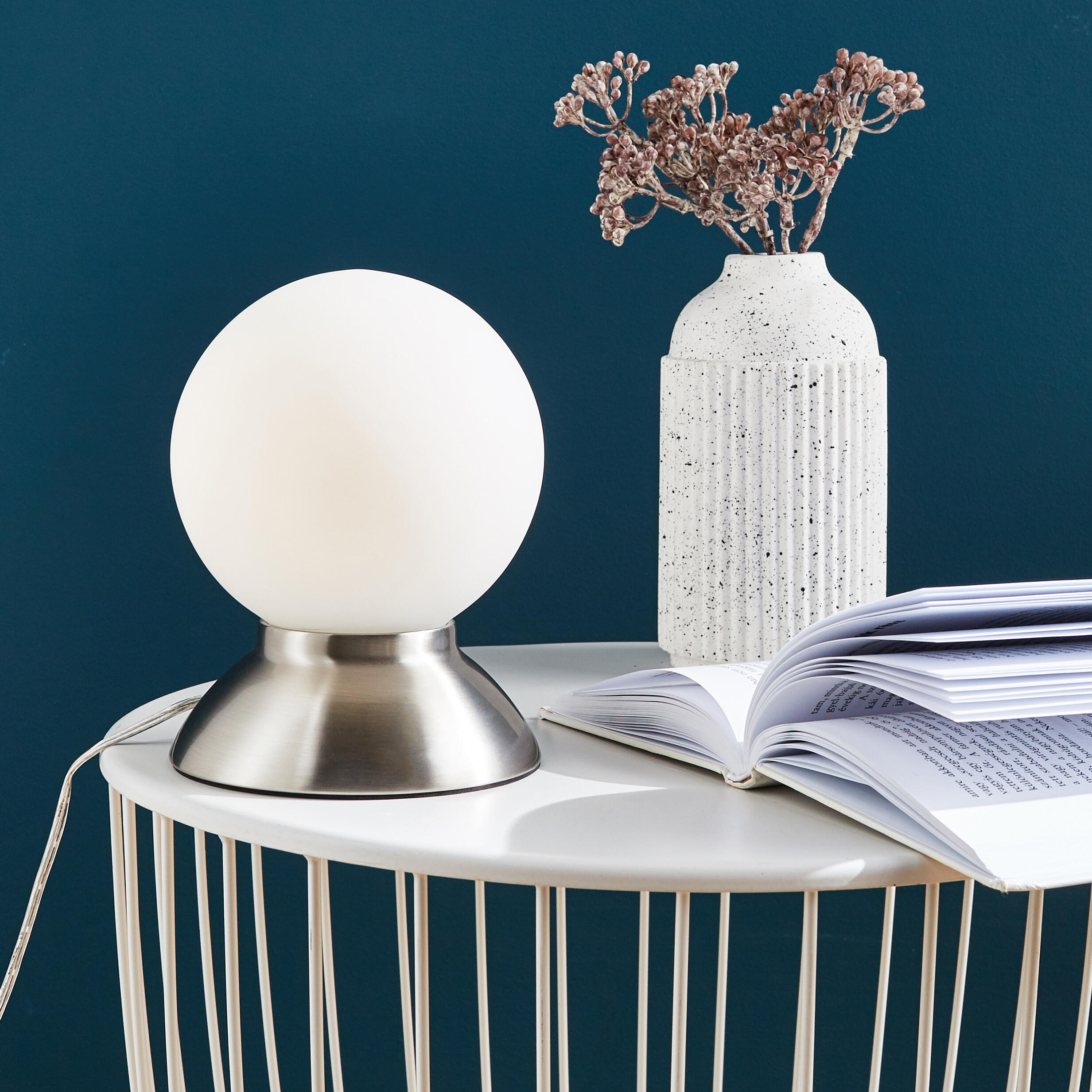 Struttura in metallo, diffusore in vetro satinato, LED integrato 4 W,, luminosità 390 LM, luce calda. Ideale per Crea una luce diffusa e accogliente nella stanza. Funzione touch integrata per selezionare 3 diverse intensità di luce. LED integrato, massima efficienza e minimo consumo energetico. Trasformatore trasparente incluso