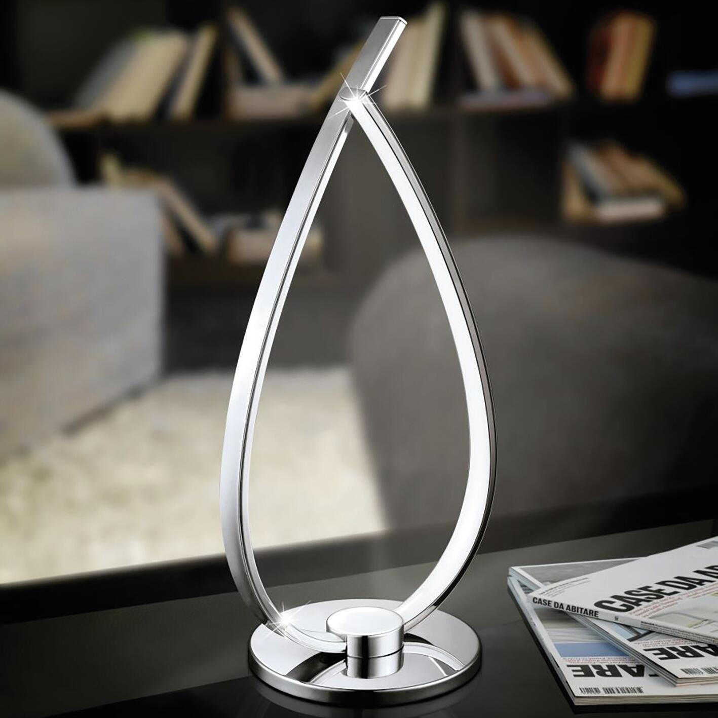 Struttura in alluminio cromato, LED integrato 14W, luminosità 1200 lm, luce calda, altezza 33.5. Indicato per una illuminazione diffusa