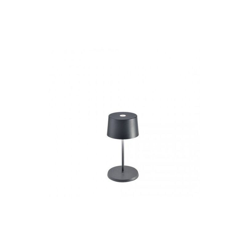 Lampada a led da tavolo Olivia pro mini ricaricabile e dimmerabile con batteria incorporata da 2,2 watt. . Lampada a led da tavolo con corpo in alluminio verniciato color grigio scuro, diffusore in policarbonato e fonte luminosa a led di 144-150 lumen. La batteria di Olivia Mini ha una durata di circa 9 ore. Batteria ricaricabile tramite base a contatto presente nella confezione . La lampada a led da tavolo Olivia Mini presenta sulla sommità del diffusore il pulsante touch di accensione della lampada che tenendolo premuto permette di regolare l'intensità luminosa da 2700K a 3000K . Mantiene la memoria dello step di dimmerazione e, alla successiva accensione, l'intensità luminosa corrisponderà a quella precedentemente impostata. Olivia Mini è una lampada a led da tavolo ideale da utilizzare nei bar, ristoranti e dehors, si utilizza molto anche nelle abitazioni, nelle camere da letto, nei salotti e negli studi professionali. Lampada a led da tavolo di design. La collezione Olivia Pro