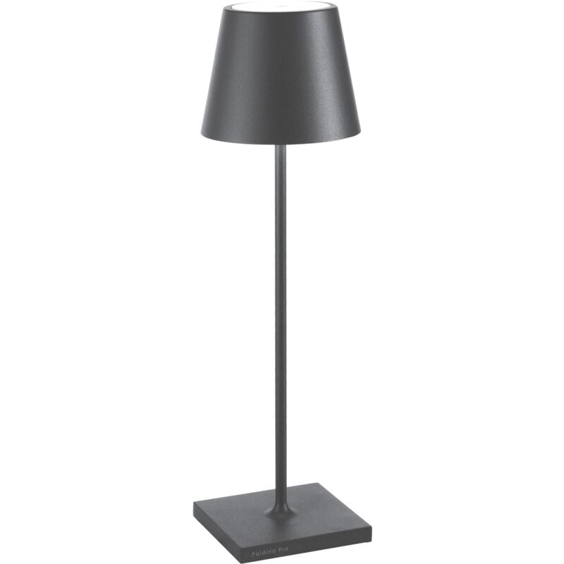 Lampada a led da tavolo Poldina Pro grigio scuro ricaricabile e dimmerabile con batteria incorporata da 2,2watt. La batteria della Poldina Pro ha una durata garantita di 9 ore alla massima potenza. Batteria ricaricabile tramite cavetto micro usb incluso nella confezione. La lampada a led da tavolo Poldina Pro è in alluminio con corpo verniciato bianco, diffusore satinato in policarbonato, dove, sulla sommità del diffusore, è presente il pulsante touch di accensione della lampada. Poldina Pro è una lampada di design ideale da utilizzare nei dehors, gazebo, bar, ristorante e aree relax, si utilizza molto anche nelle camere da letto, nei salotti e negli studi professionali. Lampada a led da tavolo di design. La collezione Poldina Pro ha un grado di protezione IP54 che la rende adatta sia all'uso interno che esterno. La colorazione della luce di Poldina Pro è luce calda (3000K). Da soli o in compagnia, fedele complice per più di 9 ore Poldina Pro è una lampada a led da tavolo con marca AI