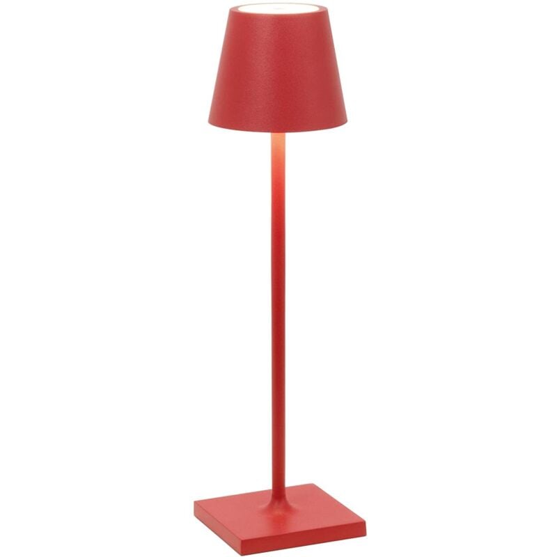 Lampada a led da tavolo Poldina Pro Micro rosso ricaricabile e dimmerabile con batteria incorporata da 1,8watt. La batteria della Poldina Pro Micro ha una durata garantita di 8 ore alla massima potenza. Tempo di Ricarica a 1A: circa 3/4h. Pacco batteria al litio ricaricabile e sostituibile. Flusso luminoso di 124-128-142 lumen. Resistenza alla nebbia salina fino a 500h. Batteria ricaricabile tramite base di contatto, con uscita USB, inclusa nella confezione. Caricatore a muro non incluso nella confezione. La lampada a led da tavolo Poldina Pro Micro è in pressofusione di alluminio con corpo verniciato rosso, diffusore satinato in policarbonato, dove, sulla sommità del diffusore, è presente il pulsante touch di accensione della lampada. Poldina Pro Micro è una lampada di design ideale da utilizzare nei dehors, gazebo, bar, ristorante e aree relax, si utilizza molto anche nelle camere da letto, nei salotti e negli studi professionali. Lampada a led da tavolo di design. La collezione