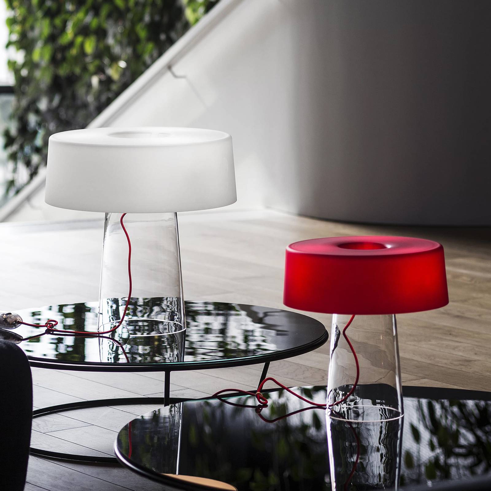 Lampada da tavolo Glam - interamente in vetro soffiato a bocca con dimmer La lampada da tavolo Glam è una fonte di luce che farà colpo, sia su un tavolino del salotto che in un ufficio prestigioso o nella hall di un hotel. È realizzata interamente in vetro soffiato a bocca. Mentre la base è trasparente, il paralume è colorato e smerigliato per ridurre l'abbagliamento delle fonti luminose e garantire una distribuzione uniforme della luce e un effetto di contrasto. Anche il cavo, rivestito in tessuto di colore rosso, spicca e dà carattere all'apparecchio. Luc Ramael ha progettato la lampada da tavolo Glam, che ancora oggi emana il suo fascino. Il designer belga crea mobili e luci che si presentano come oggetti utili senza inutili fronzoli. Il produttore di questa affascinante lampada da tavolo in vetro Glam è Prandina, un'azienda fondata da Sergio Prandina nel 1982. I prodotti del produttore sono molto riconoscibili grazie al design unico d