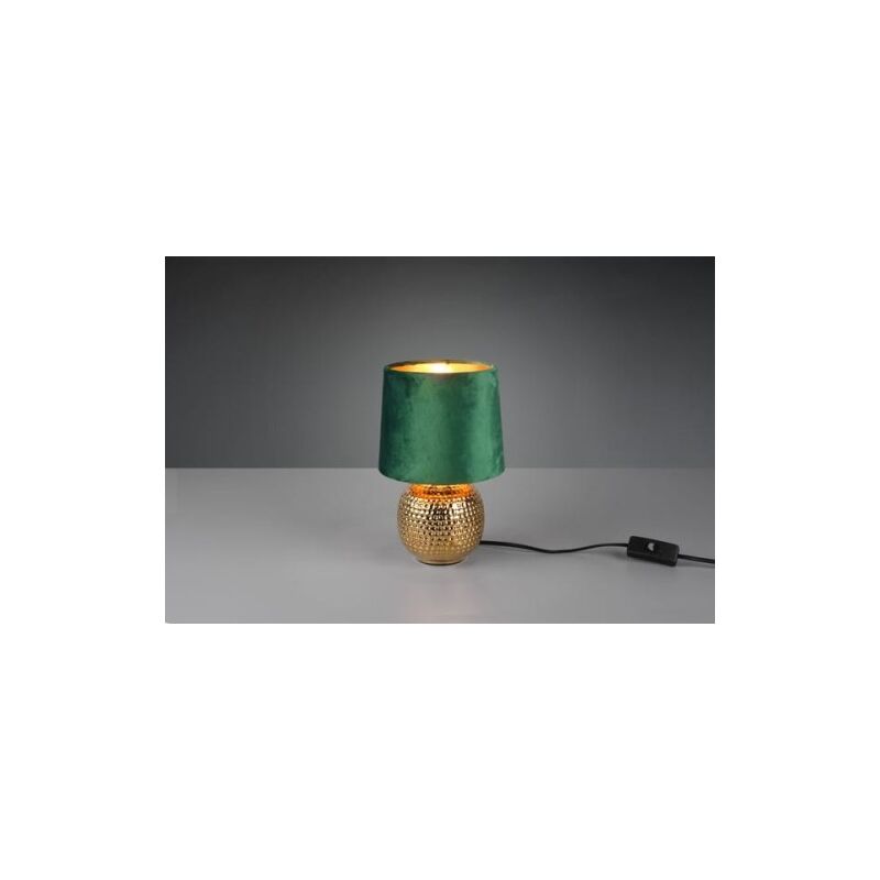 La lampada da tavolo SOPHIA di Trio Lighting presenta una base in ceramica finitura oro con motivo puntinato e paralume in velluto verde con interno oro, interruttore su filo. Dotata di attacco per l'installazione di lampadina E14 da max 40 watt (acquistabile separatamente). Per una migliore resa luminosa e al contempo un basso consumo energetico si consiglia l'utilizzo di lampadina a filamento Led di ultima generazione. Un elemento caratterizzato da un design unico, l'elemento in velluto lo rende elegante e raffinato, ideale per donare un tocco vintage contemporaneo ad ambienti residenziali o anche ricettivi. Un lume economico, perfetto per arredare con stile l'ingresso, la camera da letto o la zona living. Articolo disponibile in diversi colori: velluto blu, grigio, rosso, verde e nero.