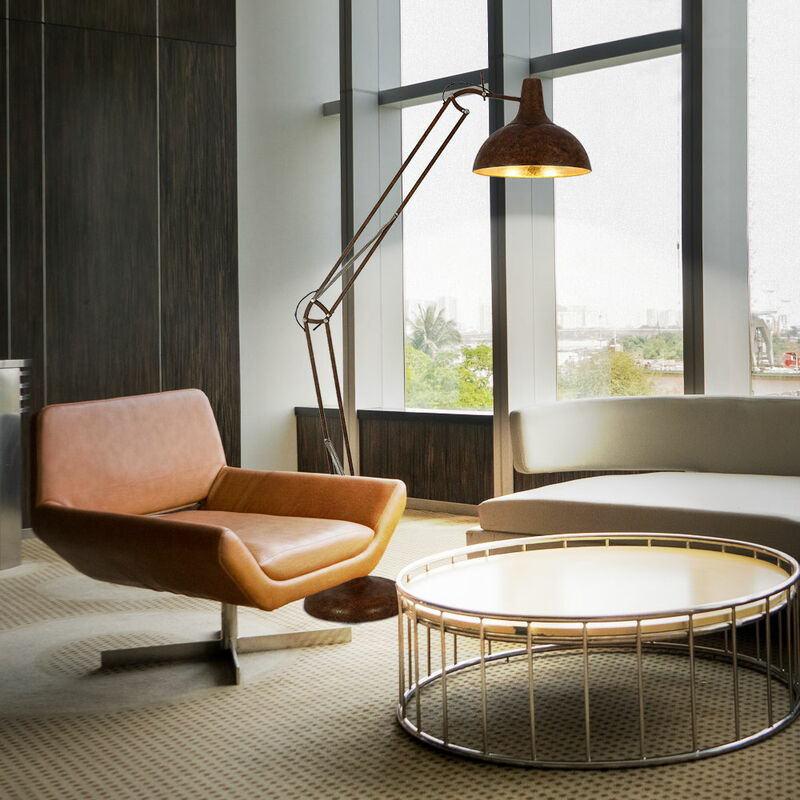 Descrizione Questa lampada da terra combina design classico e moderno. Questa lampada da terra color ruggine (colore interno paralume: oro) con un cavo di collegamento lungo 1,8 metri (incl. interruttore) è nello stile di una lampada da scrivania. Grazie ai tre snodi disponibili, questa lampada da interno raggiunge un'altezza massima di poco più di due metri. Raccomandiamo le lampade a LED per il loro risparmio energetico e la loro longevità. Puoi abbellire ulteriormente lo spazio abitativo con altri modelli di questa serie. La lampadina non è inclusa nella fornitura. dettagli • Tipo di lampada: lampada da terra • Materiale: metallo • Colore: color ruggine • Paralume: color oro (interno) • 3 giunti mobili • Lunghezza cavo: 1,8 m • Interruttore • Lunghezza x larghezza x altezza in cm: 130 x 38 x 217 • Prese: 1x E27 • Lampadina inclusa: no • Potenza: 1x massimo 60 watt • Alimentazione: 230V