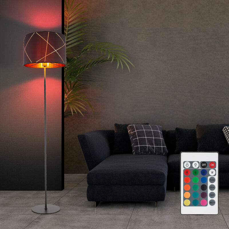Descrizione Questa lampada da terra in metallo nero incarna il glamour puro. La lampada da terra ha un paralume rotondo con punzonatura decorativa. La luce di questa bellissima lampada da terra si riflette meravigliosamente attraverso l'acrilico color oro fissato all'interno del paralume. Questa lampada da interni alta 151 cm con interruttore illumina il tuo spazio abitativo ed è flessibile nella scelta della posizione grazie al cavo tessile lungo 1,8 m incluso. Questa lampada tradizionale è particolarmente adatta per il soggiorno, la sala da pranzo e il corridoio. Altri modelli di questa serie completano il tuo spazio abitativo. Utilizzando il telecomando incluso, la lampadina LED RGB può essere regolata su diversi colori, fornendo così un'illuminazione suggestiva. Nella fornitura è inclusa una lampadina LED RGB con telecomando per luce bianca e controllo RGB. Lampada dettagli • Tipo di lampada: lampada da terra • Materiale: metallo, nero • Paralume: tessuto • Colore paralume