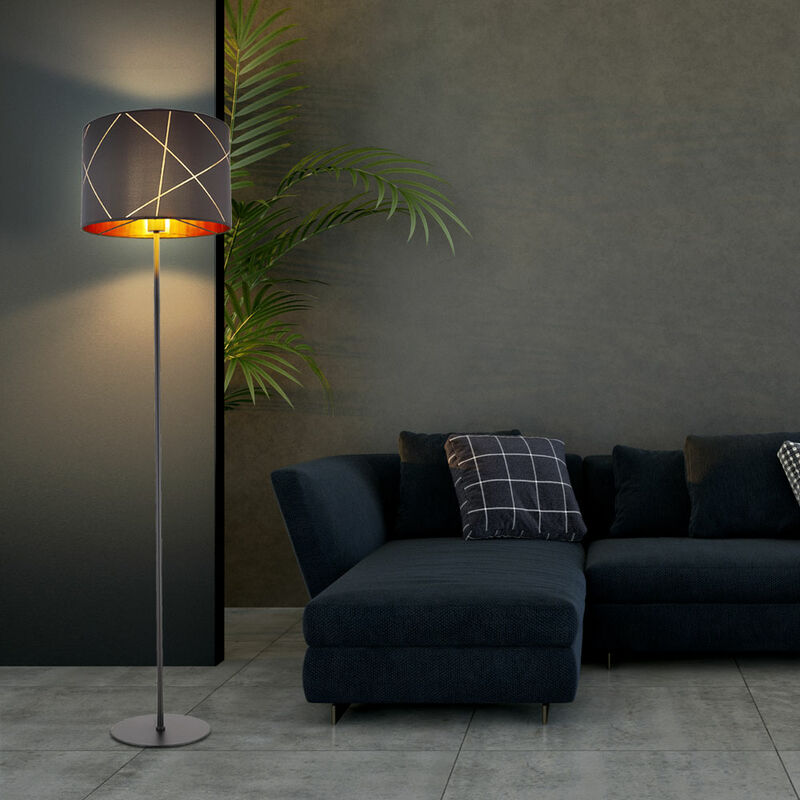 Descrizione Questa lampada da terra in metallo nero della serie BEMMO incarna il glamour puro. La lampada da terra ha un paralume rotondo con punzonatura decorativa. La luce di questa bellissima lampada da terra si riflette meravigliosamente attraverso l'acrilico color oro fissato all'interno del paralume. Questa luce interna alta 151 cm con interruttore illumina il tuo spazio abitativo ed è flessibile nella scelta della posizione grazie al cavo in tessuto lungo 1,8 m incluso. Il filetto E27 ti offre una scelta libera in termini di intensità della luce e colore quando scegli una lampada. Per la loro longevità e risparmio energetico, consigliamo le lampade a LED. Questa lampada tradizionale è particolarmente adatta per il soggiorno, la sala da pranzo e il corridoio. Altri modelli di questa serie completano il tuo spazio abitativo. La sorgente luminosa non è inclusa nella fornitura. Dettagli lampada • Tipo di lampada: lampada da terra • Materiale: metallo, nero • Paralume: tessile