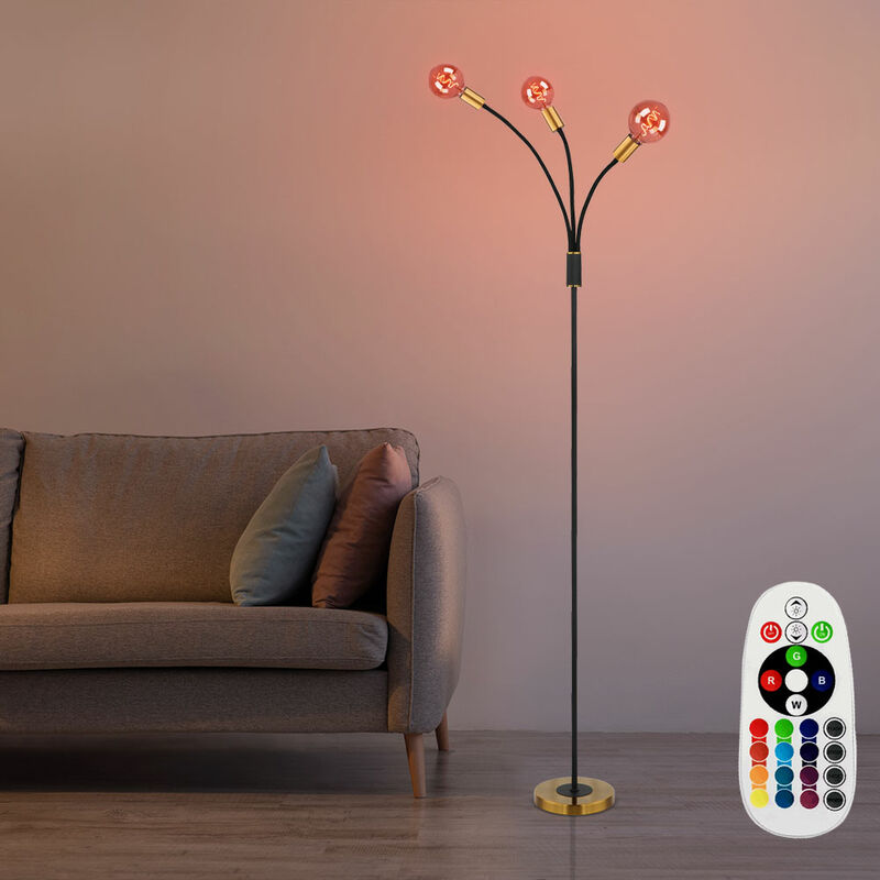 Descrizione La lampada da terra a LED EDDY, 3 lampade con interruttore a pedale facilmente accessibile, colpisce per il suo aspetto antico e allo stesso tempo semplice design. I tre semplici attacchi E27 color oro ti danno la libertà di scegliere la lampadina (max. 60W). L'altezza della lampada da terra a LED è di circa 180 cm, il diametro è di circa 70 cm. Utilizzando il telecomando in dotazione, le lampade a LED RGB possono essere impostate su diversi colori e garantire così un'illuminazione d'atmosfera. Sono incluse tre lampadine LED RGB con telecomando per luce bianca e controllo RGB. Dettagli luce • Tipo di lampada: piantana• Materiale: metallo• colore: nero, oro• bracci flessibili della lampada• interruttore a pedale• classe di protezione: IP20• diametro base lampada in cm: 25• diametro x altezza in cm: 7 x 180 • Prese: 3x E27• Lampadine incluse: Sì• Lampadina in uscita: 3x 3.5 Watt• Flusso luminoso: 3x 320 lumen• Colore luce: bianco caldo• Telecomando: Solo per la lampada