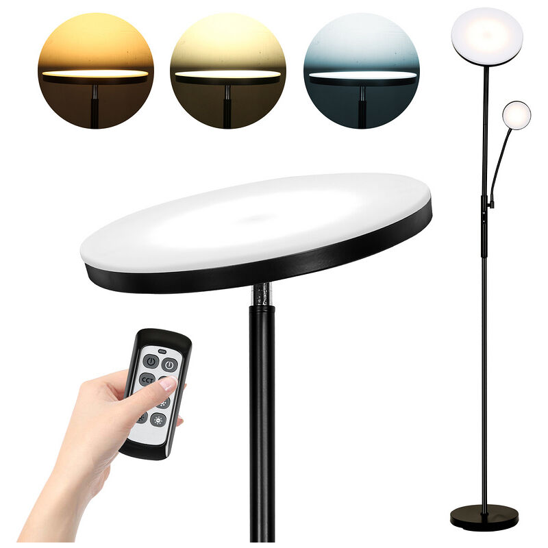 Lampada da terra a LED multifunzionale - Il faro da 27 W, 2200 lumen, fornisce un'illuminazione soffusa per il tuo soggiorno, studio, camera da letto, studio, ecc. La luce da lettura da 7 W, 500 lumen, offre comfort per leggere o lavorare prima di andare a letto. 【4 temperature di colore, attenuazione continua】 La luminosità può essere regolata dal 5% al 100%, con quattro impostazioni di temperatura del colore da 3000K-4000K-5000K-6000K per soddisfare le diverse esigenze. 【Liberamente regolabile】 La luce principale può essere regolata di 350° in orizzontale e di circa 85° in verticale, in modo da illuminare diverse aree della stanza. Le luci laterali possono essere regolate continuamente all'angolazione desiderata, perfette per leggere e lavorare. 【Telecomando o controllo touch】 Puoi regolare la luminosità e la temperatura del colore con il telecomando o il controllo touch per applicare scene diverse. La portata del telecomando è di 10 metri e il telecomando è magnetico e può essere