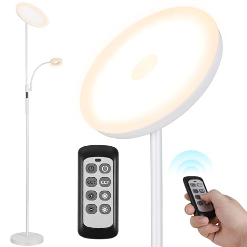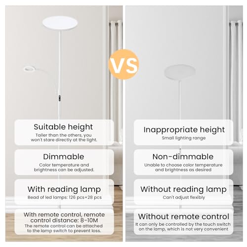 Lampada da Terra LED, Piantana Lampada 25W 2000LM, con Luce di Lettura, 3 Temperature di Colore, 3000K-5000K, Dimmerabile, con Telecomando e Controllo Tattile, per Soggiorno, Camera da Letto (Bianco)
