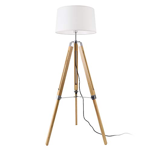 Lux.pro Lampada da Terra a Treppiede Regolabile in Altezza Piantana con Base in Legno e Metallo Paralume in Tessuto Lampadina Adatta E27 60W - Bianco/Legno Naturale